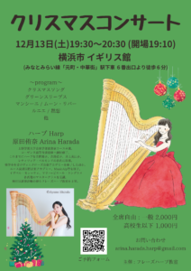 【プログラム】 G.F.ヘンデル: 組曲 変ロ長調 HWV440/ M.トゥルニエ: 古き日本のパステル画/ 吉松隆 : ライラ小景 作品99/ C.P.E.バッハ : ハープ・ソナタ/ C.ドビュッシー : 亜麻色の髪の乙女/ C.サルツェード : 古代様式の主題による変奏曲